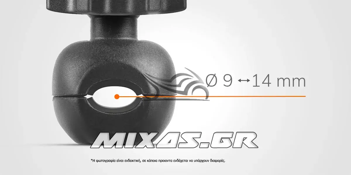Η βάση τοποθετείται εύκολα σε καθρέπτες, μπάρες ή μπαράκια, καθώς και σε κάθε στρογγυλό σωλήνα με διάμετρο από 9 mm έως 14 mm. Ο ρυθμιζόμενος βραχίονας αγκαλιάζει τον σωλήνα και σταθεροποιείται με βίδες, εξασφαλίζοντας ασφαλή και σταθερή στήριξη ακόμα και κατά την οδήγηση.