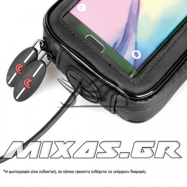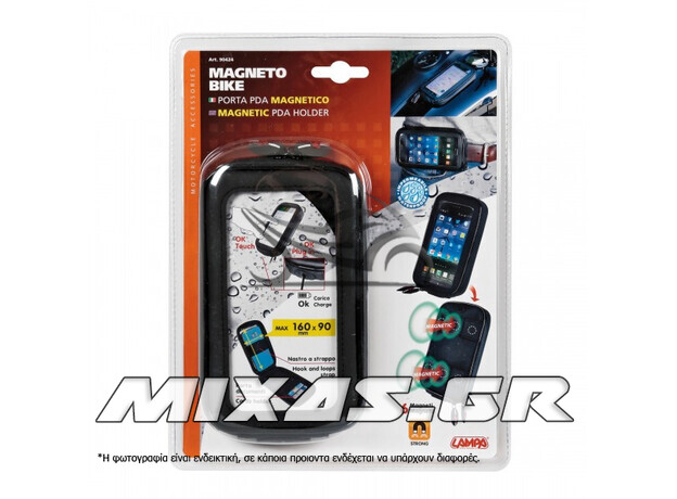 Βάση (θήκη) αποθήκευσης και μεταφοράς για το τηλέφωνο (smartphone) ή το σύστημα πλοήγησης (GPS), ιταλικής προέλευσης από την εταιρία LAMPA.Η βάση (θήκη) διαθέτει οθόνη με λειτουργία συστήματος αφής (touch screen) και υποδοχή για καλώδιο φόρτισης της συσκευής για να φορτίζει παράλληλα, ενώ βρίσκεται σε χρήση μέσα στην θήκη. Στο εσωτερικό της θήκης υπάρχει ελαστικός ιμάντας συγκράτησης της συσκευής αλλά και 2 υποδοχές για πιστωτικές ή χρεωστικές κάρτες. Η θήκη διαθέτει στο πίσω μέρος της 6 μαγνήτες για να μπορείτε να την στηρίξετε σε οποιαδήποτε επιφάνεια που μπορεί να μαγνητίσει (ντεπόζιτο/ ρεζερβουάρ μηχανής κ.α) αλλά και ιμάντες για να μπορείτε να την στηρίξετε στην ζώνη του παντελονιού σας.